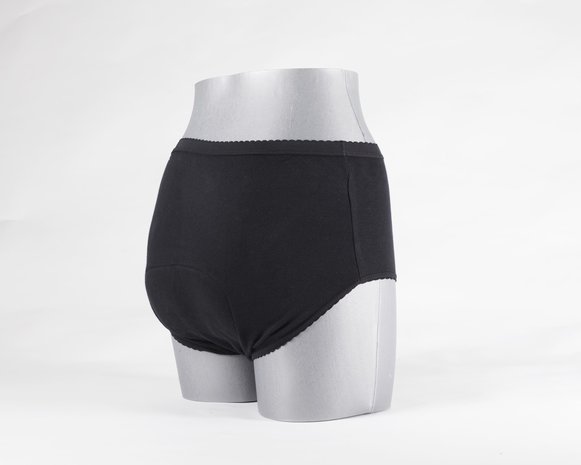 Goed verkocht model traditionele incontinentie damesslip met vaste wasbare absorptie inlegger en afgewerkte rand.